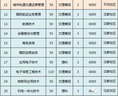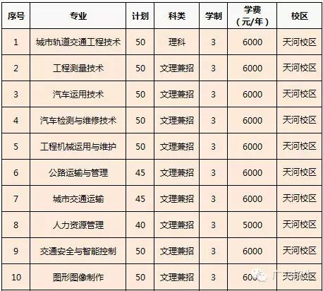我校最新或2022(历届)年自主招生计划招生1140人:面向普通高中应、往届毕业生招生:1050 人,20个专业; 面向中职应、往届毕业生招生:90人,2个专业普通高中毕业生备注:航海技术专业只招收男生,裸眼视力不低于4.7,且不招收色盲的考生;城市轨道交通运营管理专业用人单位对身高有要求(男身高170 cm及以上,女160cm及以上)且不得色盲。中职毕业生序号专业计划科类 学制学费(元/年)校区1汽车运用技术30中职26000天河校区2电气自动化技术60中职36000花都校区对应各中职专业及技能等级证书专业中职学校对应专业对应技能证书 汽车运用技术汽车运用与维修、汽车制造与检修、汽车车身修复、汽车整车与配件营销、汽车电子技术应用、汽车美容与装潢1、汽车维修工、汽车维修电工、汽车修理工等中级以上(含中级)证书,由省人事劳动部门(或授权)机关颁发。2、电工技能课程、电子技能课程、机械技能课程B级以上(含B级)由省教育考试院颁发。电气自动化技术电气运行与控制(或电气自动化)、电气技术应用、继电保护及自动装置调试维护、机电设备安装与维修1、电工上岗证证书,由安监局(或授权)机关颁发;维修电工证、电气设备安装工、电子产品维修工、电子CAD绘图员、机械CAD绘图员等中级以上(含中级)证书,由省人事劳动部门(或授权)机关颁发。2、电工技能等专业技能课程B级以上(含B级)证书由省教育考试院颁发。备注: 住宿费 一级公寓(含引资公寓)1000~1500元/年;普通公寓650~750元/年,按实收取。